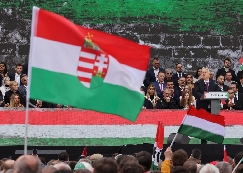2025年10月23日,匈牙利总理欧尔班(前右)在首都布达佩斯举行的一场集会上讲话。新华社发(弗尔季·奥蒂洛摄)
