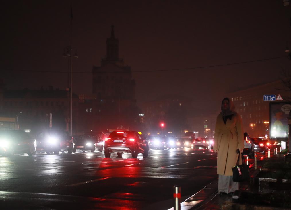 2025年11月20日,因俄罗斯对乌克兰发动大规模空袭,乌首都基辅主要街道的照明设施出现大面积停电,夜色中市民在路边等车。新华社记者李东旭摄